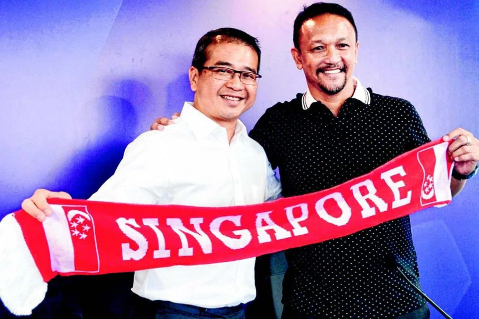 சிங்கப்பூர் காற்பந்து சங்கத்தின் துணைத் தலைவர் எட்வின் தோங்குடன் (இடது) இளையர் அணி பயிற்றுவிப்பாளராக நியமிக்கப்பட்டுள்ள ஃபாண்டி அகமது. படம்: ஸ்ட்ரெய்ட்ஸ் டைம்ஸ்