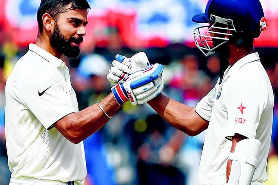 இந்திய அணித் தலைவர் கோஹ்லியும் ரகானேவும் 365 ஓட்டங்களைக் குவித்து நான்காவது விக்கெட்டுக்கு அதிக ஓட்டங்கள் குவித்த இந்திய ஜோடி என்ற பெருமையைப் பெற்றனர். படம்: ஏஎஃப்பி