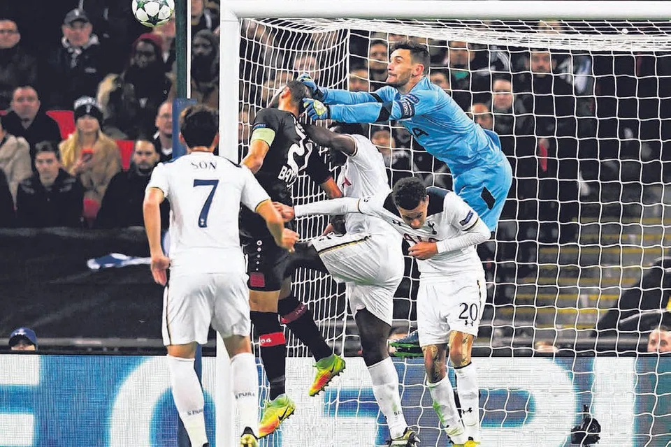 லெவகுசனின் கோல் முயற்சியைத் தடுக்க பாயும் ஸ்பர்ஸ் கோல்காப்பாளர் (இடது). படம்: ராய்ட்டர்ஸ்