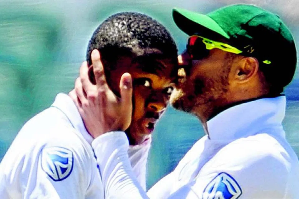 ஆஸ்திரேலியாவின் விக்கெட்டுகளைக் கைப்பற்றி வெற்றியைப் பெற்றுத் தந்த ரபாடாவைப் பாராட்டும் அணித்தலைவர் டு பிளஸ்ஸி. படம்: ஏஎஃப்பி