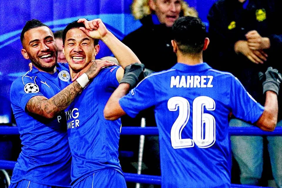 லெஸ்டரின் முதல் கோலைப் புகுத்திய மகிழ்ச்சி யில் ஷின்ஜி ஓகாசாகி (நடுவில்). படம்: ராய்ட்டர்ஸ்