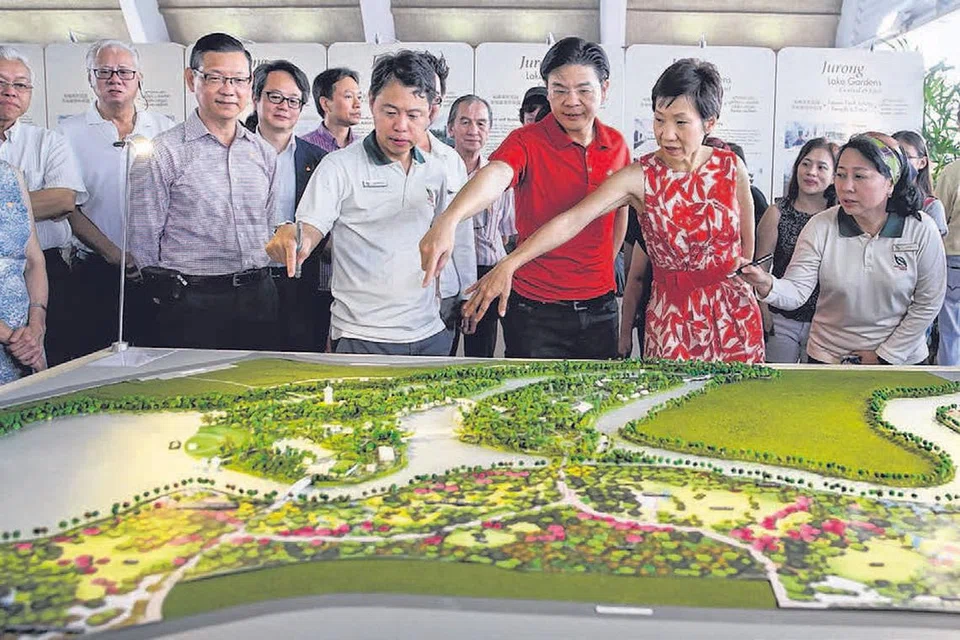 தேசிய வளர்ச்சி அமைச்சர் லாரன்ஸ் வோங் (சிவப்பு உடை) கலாசார, சமூக, இளையர் அமைச்சர் திருவாட்டி கிரேஸ் ஃபூ முதலானோர் ஜூரோங் ஏரி தோட்டங் களுக்கான திட்ட மாதிரியைப் பார்வையிடுகிறர்கள். படம்: ஸ்ட்ரெய்ட்ஸ் டைம்ஸ்