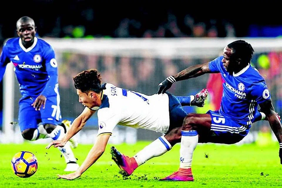 ஸ்பர்ஸ் குழுவின் சன் ஹியுங் மின்னின் முன்னேற்றத்தைத் தடுத்து நிறுத்துகிறார் செல்சி குழுவின் விக்டர் மோசஸ் (வலது). படம்: ராய்ட்டர்