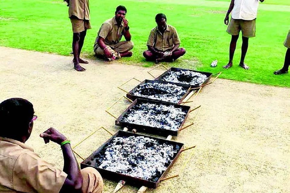 புயலால் பெய்த மழை காரணமாக ஈரமாகிவிட்ட சேப்பாக்க விளையாட்டுத் திடலை உலர்த்தும் வகையில் தகர டப்பாக்களில் நிலக்கரி எரியூட்டி வைத்துவிட்டு குளிர்காயும் ஊழியர்கள். படம்: டுவிட்டர்