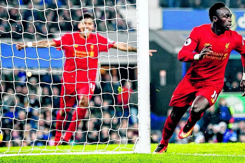 கோல் போட்ட மகிழ்ச்சியில் எவர்ட்டனுக்கு எதிராக லிவர்பூலின் சாடியோ மானே (வலம், சிவப்பு சீருடையில்). படம்: ராய்ட்டர்ஸ்