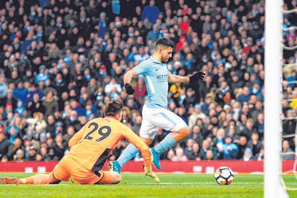 பர்ன்லியின் கோல் காப்பாளரைத் தாண்டி சிட்டியின் இரண்டாவது கோலைப் போட முயலும் செர்ஜியோ அகுவேரோ. படம்: ஏஎஃப்பி