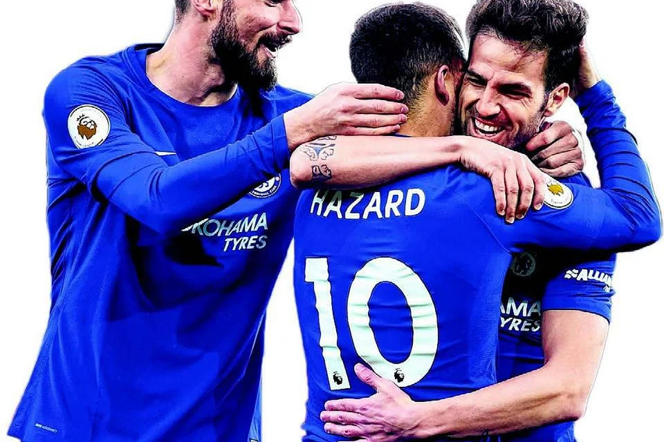 செல்சியின் வெற்றி கோலை அடித்த ஃபேப்ரிகாசை (வலது) பாராட்டும் ஜிரூ (இடது), ஹஸார்ட். படம்: ராய்ட்டர்ஸ்