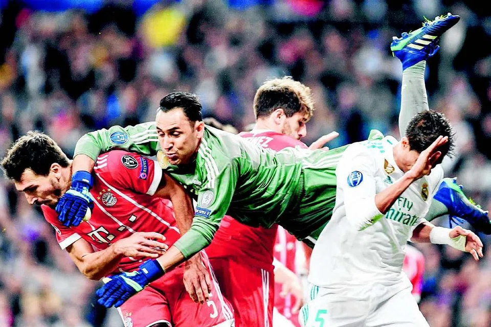 பயர்ன் மியூனிக் வீரர்களிடம் இருந்து பந்தைப் பறிக்கப் பாயும் ரியால் கோல்காப்பாளர் நவாஸ் கெய்லோர் (நடுவில்). படம்: ஏஎஃப்பி