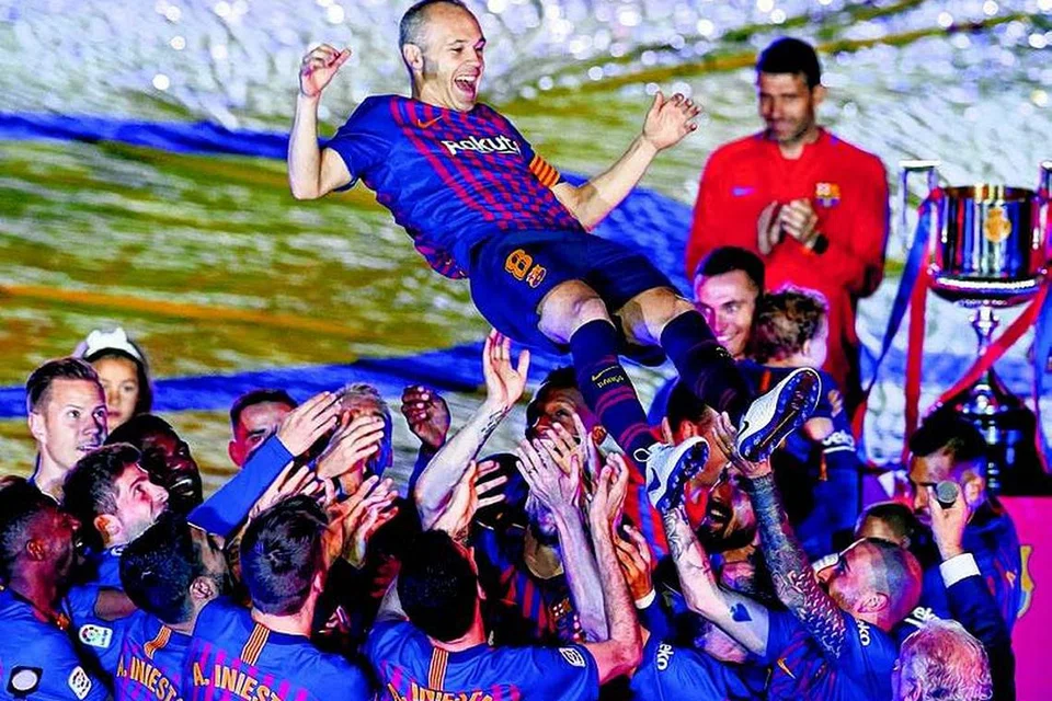 பார்சிலோனா குழுவில் இருந்து விடைபெறும் இனியெஸ்டாவைக் கொண்டாடும் வீரர்கள். படம்: ஏஎஃப்பி