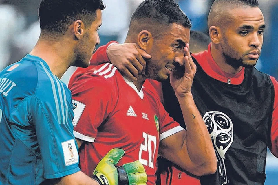 ஆட்டத்தின் கடைசித் தருணத்தில் சொந்த கோலடித்து அணியைத் தோல்வியுறச் செய்துவிட்டோமே என்ற சோகம் தாங்காமல் கண்ணீர் உகுக்கும் மொரோக்கோ ஆட்டக்காரர் அஸிஸ் பௌஹடோஸை (நடுவில்) தேற்றும் சக வீரர்கள். படம்: ஏஎஃப்பி