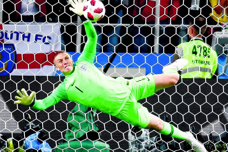 பெனால்டி வாய்ப்புகளில் கொலம்பிய அணியின் இறுதி முயற்சியைத் தடுத்து இங்கிலாந்து அணியை வெற்றிப் பாதைக்கு அழைத்துச் சென்ற கோல்காப்பாளர் ஜோர்டன் பிக்ஃபர்ட். படம்: ராய்ட்டர்ஸ்