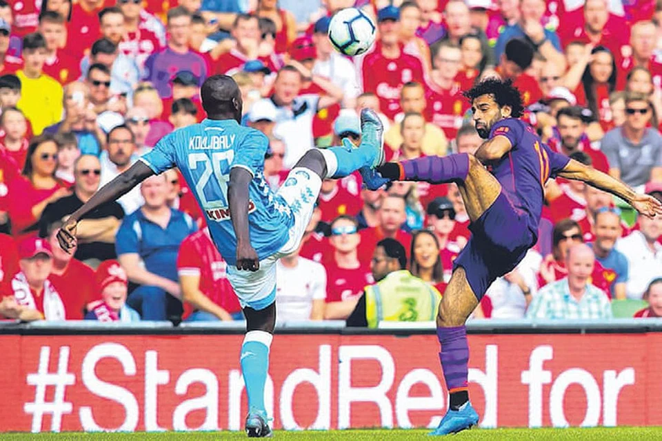 லிவர்பூலின் எகிப்திய மத்திய திடல் ஆட்டக்காரரான முகமது சாலா (வலது), நெப்போலியின் சினேகல் தற்காப்பு ஆட்டக்காரரான கலிது குலிபலியுடன் பொருதுகிறார். படம்: ஏஎஃப்பி