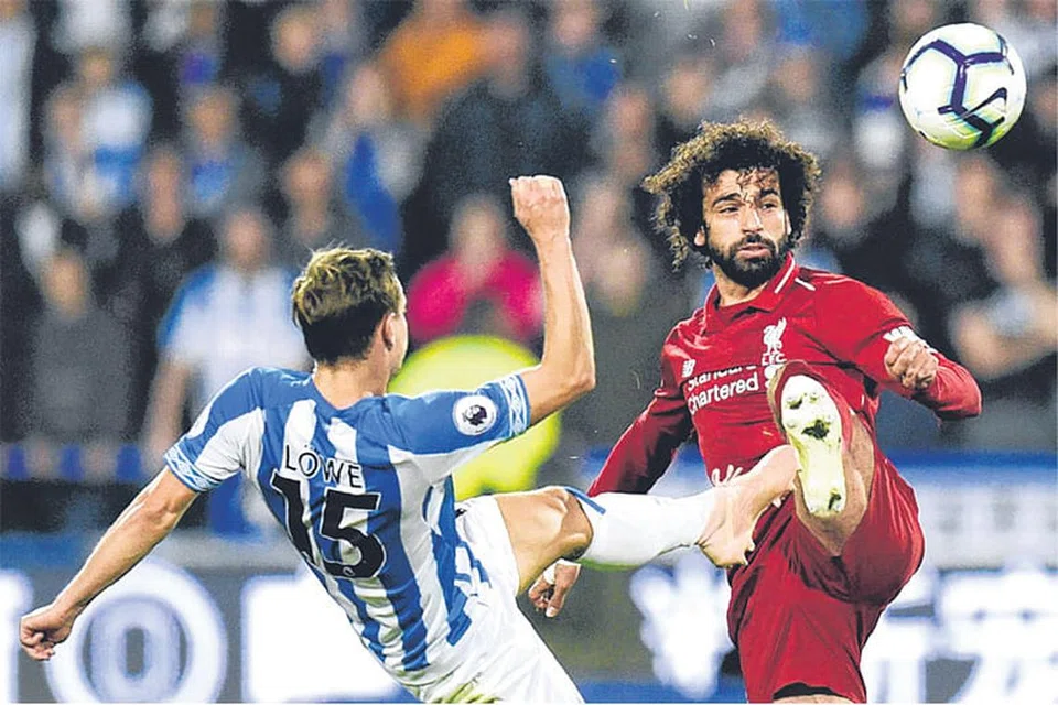 ஹடர்ஸ்ஃபீல்ட் டவுன் அணியின் ஜெர்மன தற்காப்பு ஆட்டக்காரர் கிறிஸ் லோ (இடது) தட்டிப் பறிப்பதற்குள் பந்தைத் தூக்கி அடித்த முகம்மது சாலா. படம்: ஏஎஃப்பி