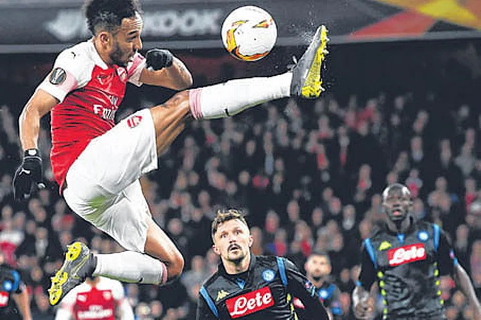 ஆர்சனலின் ஒபமயாங்கின் (இடது) சாகசத்தைக் கண்டு மிரளும் நேப்போலி வீரர்கள். படம்: இபிஏ -