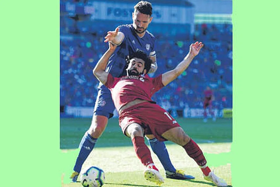 நேற்று முன்தினம் கார்டிவ் சிட்டியுடன் மோதிய லிவர்பூலின் முகம்மது சாலா எதிரணி வீரர் கைபட கீழே விழும் காட்சி. இதில் கிடைத்த பெனால்டியினால் லிவர்பூலின் ஜேம்ஸ் மில்னர் லிவர்பூலின் இரண்டாவது கோலை போட்டார். படம்: இபிஏ
