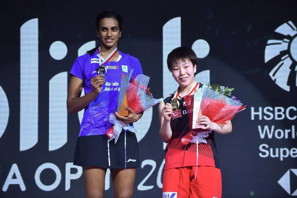 இந்தியாவின் பி.வி.சிந்துவை வீழ்த்தி பட்டத்தைக் கைப்பற்றிய ஜப்பானின் அகானே யமகுச்சி. படம்: ஏஎப்பி -