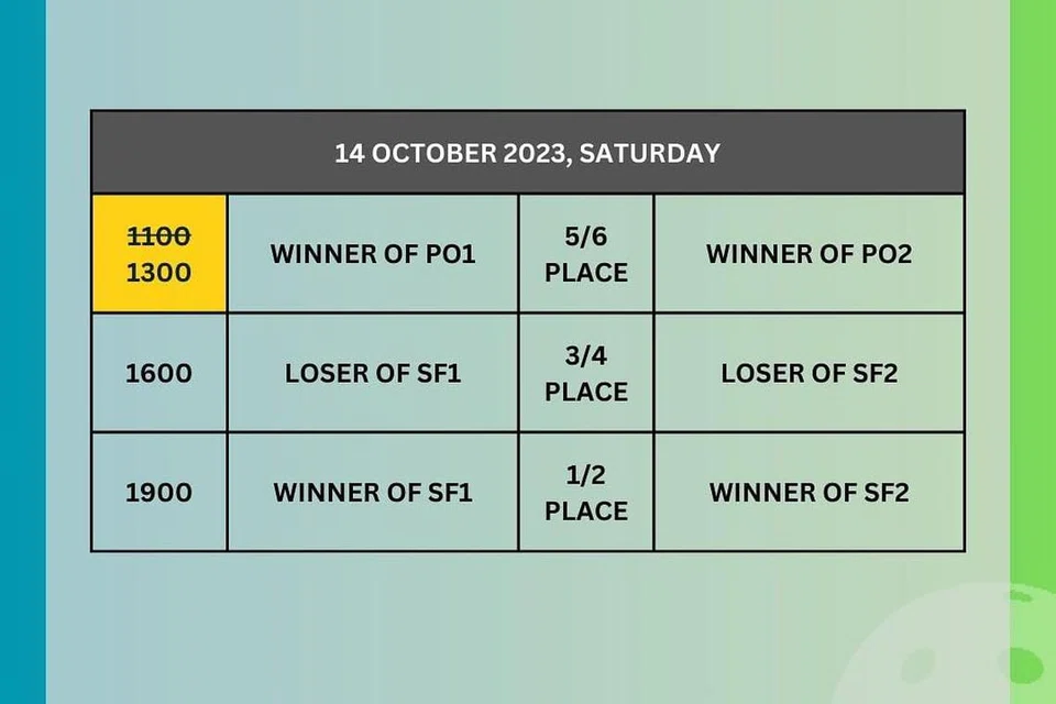 எனினும், வெள்ளிக்கிழமை அக்டோபர் 13 இரவு 7 மணிக்கு நடைபெறும் அரையிறுதி ஆட்டத்தின் முடிவில் ஓரணியே இறுதிச் சுற்றுக்குத் தகுதிபெறும்.