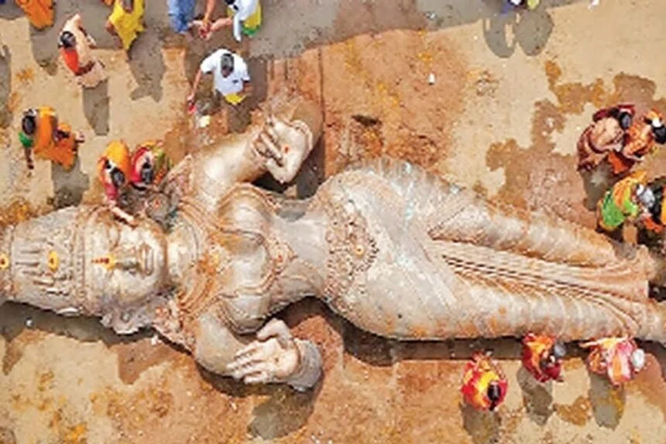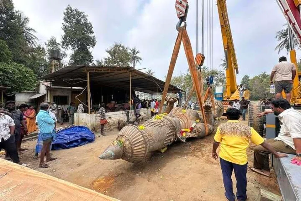 அப்பணி நிறைவடைந்ததையொட்டி, வெள்ளிக்கிழமை (பிப்ரவரி 18) காலையில் மூன்று ராட்சத பாரந்தூக்கிகள் மூலம் லாரியில் 38 அடி உயர சிலை ஏற்றப்பட்டு, சிறப்புப் பூசைகள் செய்யப்பட்டு, மேளதாளங்கள் முழங்க சீரும் சிறப்புமாக அனுப்பிவைக்கப்பட்டது.