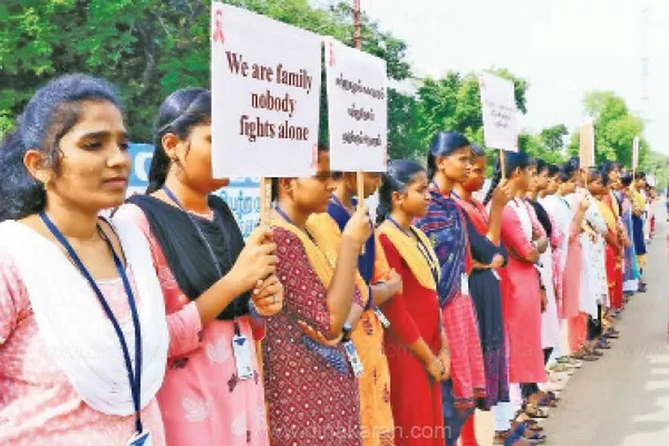 இக்கல்லூரியின் ஏராளமான மாணவிகள் இளம் சிவப்பு நிற ஆடையுடன் விழிப்புணர்வு பதாகைகளை ஏந்தியபடி கல்லூரி முன்புற சாலையில் மனித சங்கிலியாக அணிவகுத்து நின்றனர்.