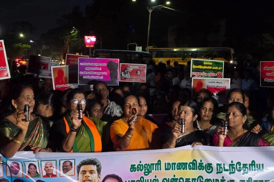 கைகளில் பெப்பர் தெளிப்பான், தீப்பந்தம் ஏந்தி பாதிக்கப்பட்ட மாணவிக்கு நீதி கேட்டும், திமுக அரசைக் கண்டித்தும் ஆர்ப்பாட்டம் நடைபெற்றது.