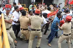 அப்போது சாலை சந்திப்பிலேயே அவர்களைத் தடுத்து நிறுத்திய காவல்துறையினர் பேச்சுவார்த்தை நடத்திக்கொண்டிருந்தனர்.