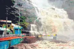 அதேபோன்று பிரதான அருவியிலும் பாதுகாப்பு வளைவைத் தாண்டி தண்ணீர் ஆர்ப்பரித்தது. இதனால் கயிறுகளைக் கட்டி காவல்துறையினர் பாதுகாப்புப் பணியில் ஈடுபட்டனர்.