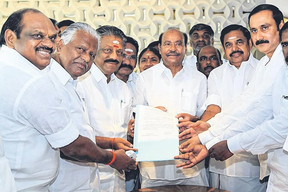 அதிமுக கூட்டணியில் கையெழுத்தான ஒப்பந்தத்துடன் பாமக நிறுவனர் ராமதாஸ் (நடுவில்). படம்: ஊடகம்