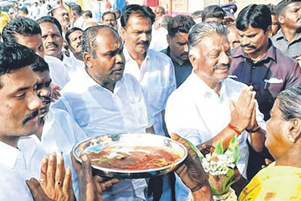 ஓ. பன்னீர்செல்வம், அமைச்சர், வேட்பாளர் ஆகியோர் ஆரத்தியெடுத்து வரவேற்கப்பட்டனர். படம்: தமிழக ஊடகம் -