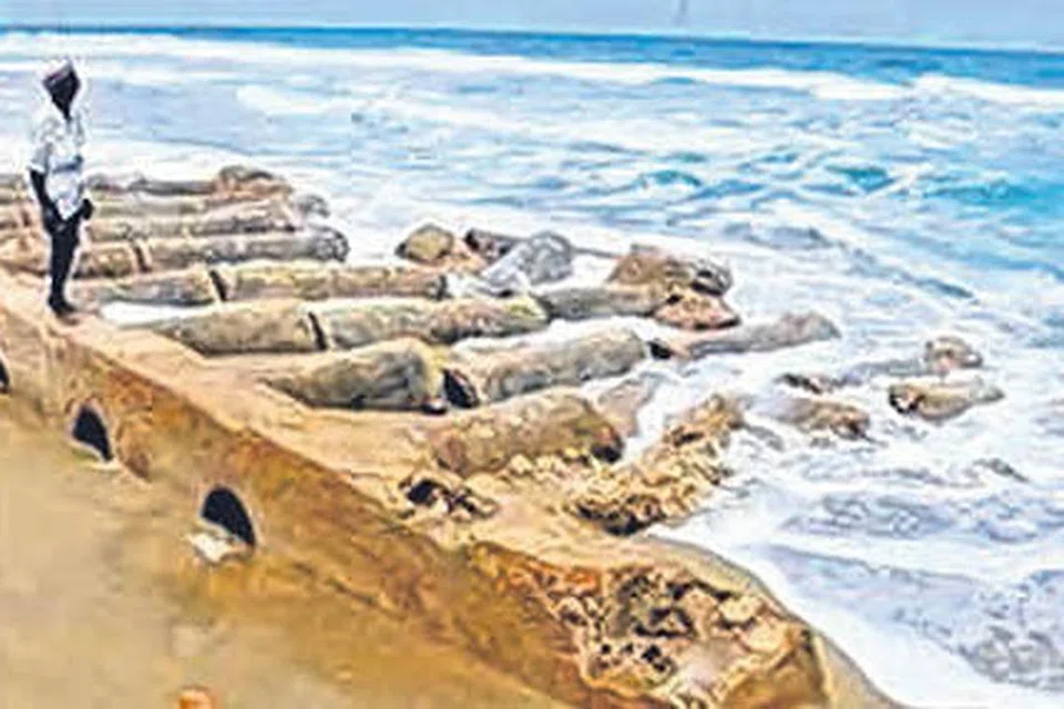 தனுஷ்கோடி: தனுஷ்கோடியில் 1964ஆம் ஆண்டு, புயலால் சேதமாகி கடலுக்குள் மூழ்கிப்போன சாலைப் பாலம் 55 ஆண்டுகளுக்குப் பிறகு தற்போது வெளியில் தெரிகிறது. இப்பாலத்தை ஏராளமான சுற்றுலாப் பயணிகள் ஆச்சரியத்தோடு பார்த்துச் செல்கின்றனர்.