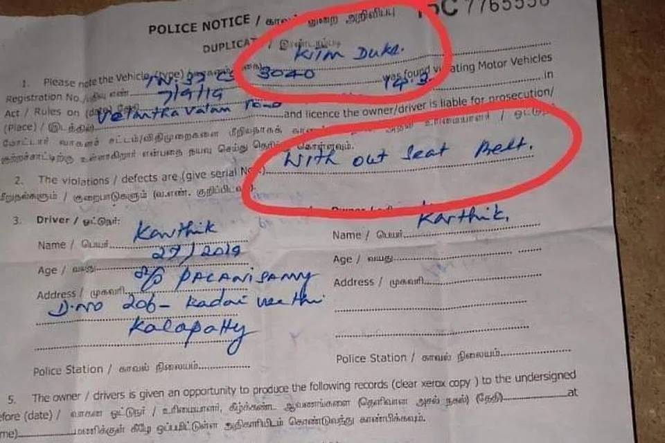 அந்த அபராதத் தொகைக்கான ரசீதையும் பெற்றார். பின்பு வீடு திரும்பிய கார்த்திக், அபராதத் தொகை ரசீதைப் பார்த்தபோது, அதில் 'ஹெல்மெட் அணியாமல் சென்றதற்கு' என்று குறிப்பிடுவதற்குப் பதிலாக 'சீட் பெல்ட் அணியாமல் சென்றதற்கு' என்று குறிப்பிடப்பட்டிருந்தது. மேலும் அபராதத் தொகையும் ரசீதில் குறிப்பிடப்படவில்லை.