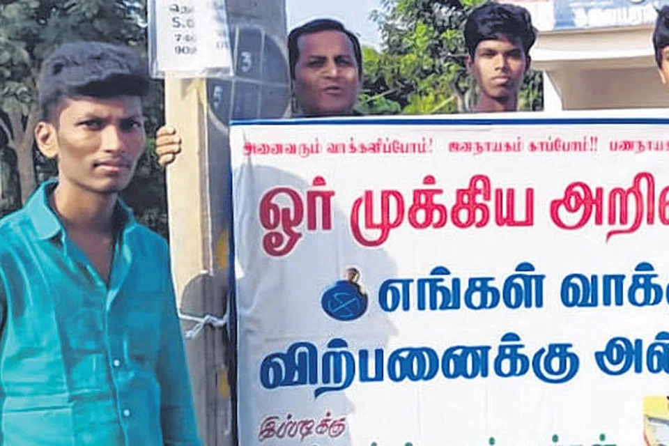 பெரியகோட்டை அருகே உள்ள தெக்கூர் பகுதியில் இயங்கி வருகிறது வ.உ.சி. நற்பணி மன்றம். இதில் உறுப்பினர்களாக உள்ள இளையர்கள், "எங்கள் வாக்கு விற்பனைக்கு அல்ல" எனும் வாசகம் அடங்கியுள்ள பலகையுடன் வேட்பாளர்களின் வீடு தேடிச் செல்கிறார்கள்.
