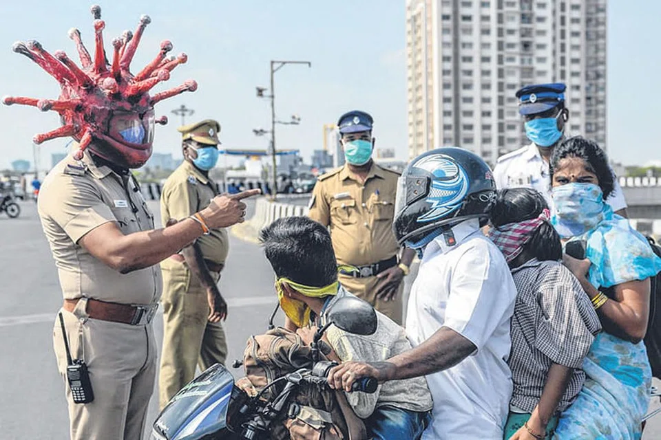 சென்னையில் 'கொரோனா கிருமி' ேதாற்றம் கொண்ட தலைக்கவசத்தை அணிந்து மக்களுக்கு அறிவுரை வழங்குகிறார் காவல்துறை ஆய்வாளர் ராஜேஷ் பாபு. படம்: ஊடகம் -