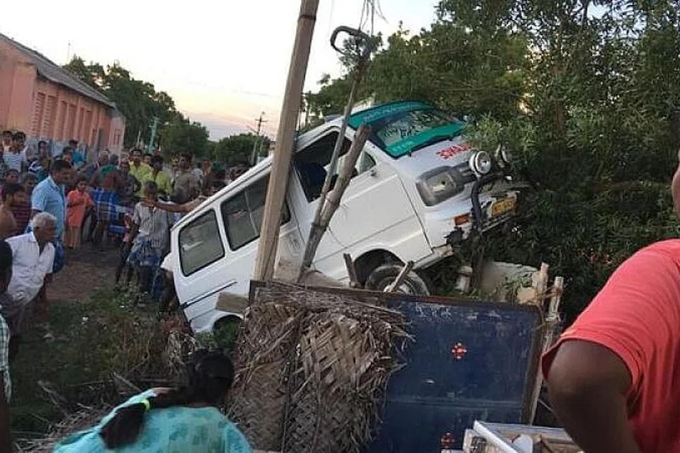 கூரை வீட்டை உடைத்துக்கொண்டு சென்ற ஆம்புலன்ஸ் அங்கு அடுக்கி வைக்கப்பட்டிருந்த கம்புகள் மேல் சென்று அந்தரத்தில் நின்றது.