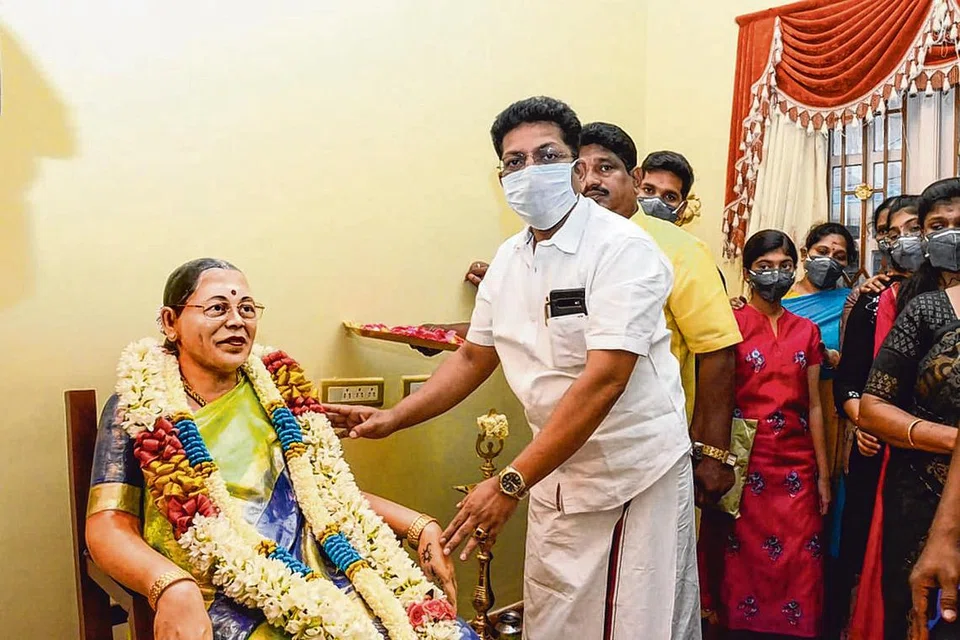 மதுரை, மேல பொன்னநகரத்தைச் சேர்ந்த தொழிலதிபர் சி.சேதுராமன், 74, தனது மனைவி இறந்த 30வது நாளில் அவரது சிலையை மதுரை வில்லாபுரத்தைச் சேர்ந்த சிற்பி பிரசன்னா, ஓவியர் மதுரை மருது ஆகியோரைக் கொண்டு வடிவமைத்துள்ளார்.