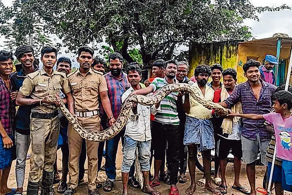 திருப்பத்தூர் மாவட்டம், ஆம்பூர் அருகே ஜெயராமன் என்ற விவசாயி நிலத்தில் ஊழியர்கள் நெற்கதிர்களை அறுவடை செய்துகொண்டு இருந்துள்ளனர். அப்போது மலைப்பாம்பு ஒன்று நெளிந்துள்ளது. இதைக்கண்ட பெண்கள் அலறியடித்து ஓட்டம் பிடித்துள்ளனர். இதையடுத்து அங்கு வந்த ஆம்பூர் தீயணைப்புத் துறையினர், 12 அடி நீளமுள்ள இந்த மலைப்பாம்பை பிடித்து ஆம்பூர் அருகே உள்ள காட்டுப் பகுதியில் பாதுகாப்பாக விடுவித்தனர்.