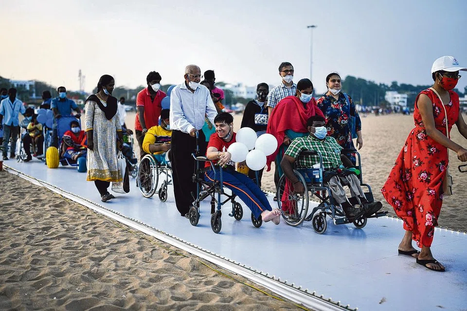 சென்னை: மாற்றுத்திறனாளிகளும் கடல் அலைகளை அருகில் கண்டு ரசிக்கவும் அவற்றில் கால் நனைக்கவும் வசதியாக சென்னை மெரினா கடற்கரையில் தற்காலிகப் பாதை அமைக்கப்பட்டிருக்கிறது.