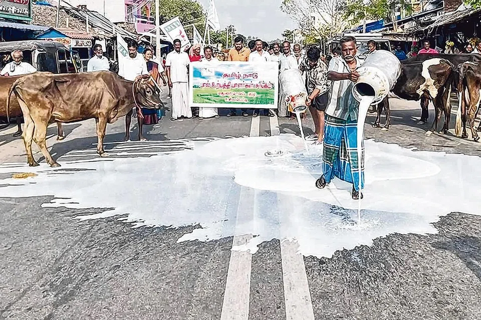 கருமாத்தூரில் பால் உற்பத்தியாளர்கள் நேற்று காலை சாலையில் பாலை கொட்டி போராட்டம் நடத்தினர். படம்: தமிழக ஊடகம்