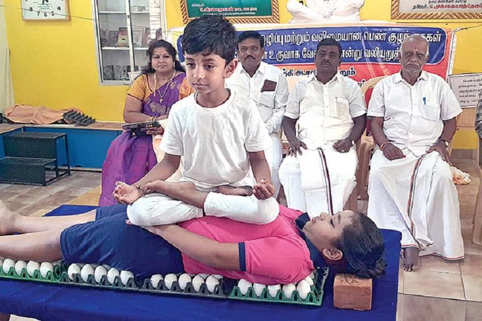 அப்போது ரவீணா என்ற சிறுமி முட்டைகள் மீது படுத்திருக்க, அவர் மீது அமர்ந்து சிறுவன் சாய் விஸ்வா யோகா ஆசனங்கள் செய்தார். இது பார்வையாளர்களை வெகுவாக கவர்ந்தது.