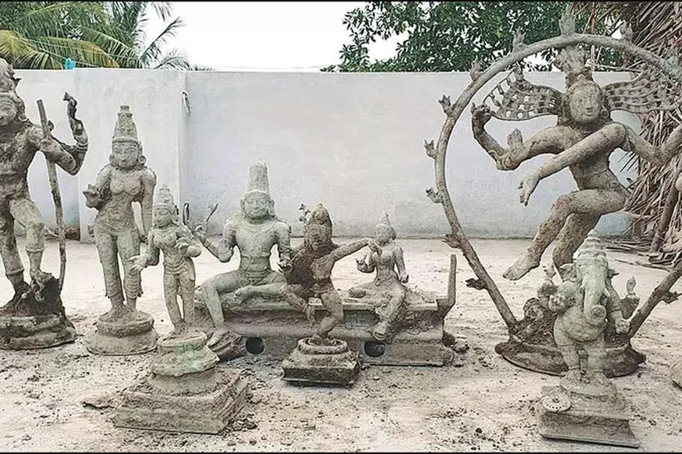 இந்நிலையில், உத்திராபதி குடும்பத்தார் பள்ளம் தோண்டும் பணியைத் தொடர்ந்து மேற்கொண்டபோது ஆறு பழங்கால சாமி சிலைகள் புதைத்து வைக்கப்பட்டிருந்தது தெரியவந்தது. இரவோடு இரவாக அவர்கள் அச்சிலைகளை எடுத்து வீட்டுக்குள் பத்திரப்படுத்தினர்.