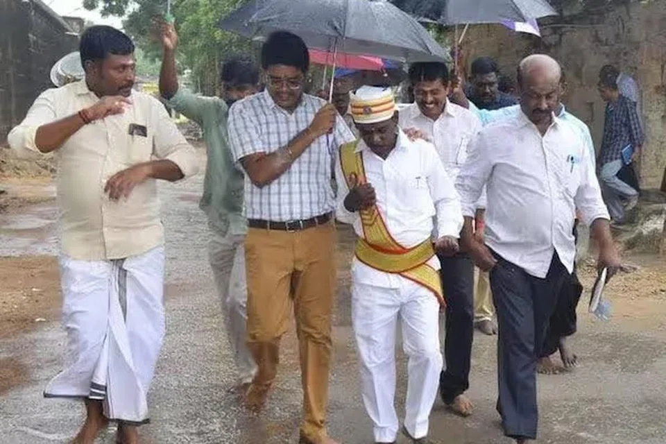 குடையைப் பெற்றுக்கொண்ட ஆட்சியர், தனது உதவியாளரை அருகில் அழைத்து அவரது தோளில் கைபோட்டபடி மழையில் நனையாமல் பாதுகாத்தார். உடன் வரும் அதிகாரிகள், ஊழியர்கள் நனைந்தாலும் கண்டுகொள்ளாத உயர் அதிகாரிகள் மத்தியில், உதவியாளரும் ஒரு மனிதர் தானே? எனக் கேட்டு குடை பிடித்துள்ள ஆட்சியர் விஷ்ணு சந்திரனை மக்கள் பாராட்டி வருகின்றனர்.