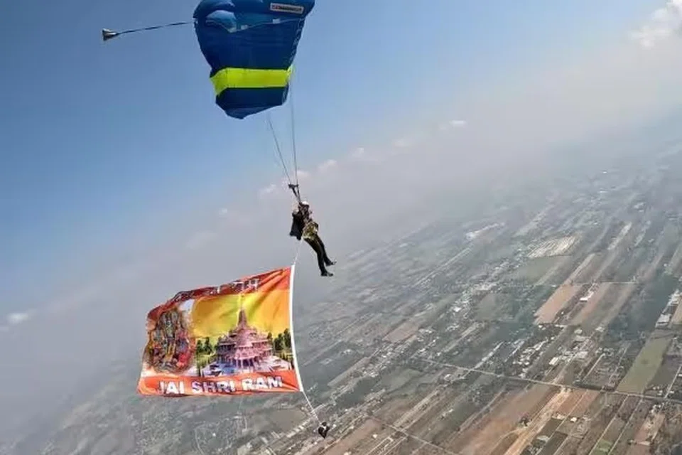 இந்நிலையில் தாய்லாந்து தலைநகர் பேங்காக்கில் அயோத்தி கோவில், ராமர் உருவப்படம், ஜெய்ஸ்ரீராம் எனும் எழுத்துகள் பொறிக்கப்பட்ட கொடியுடன் பத்தாயிரம் அடி உயரத்தில் இருந்து (ஸ்கை டைவிங்) குதித்துள்ளார் ராஜ்குமார்.