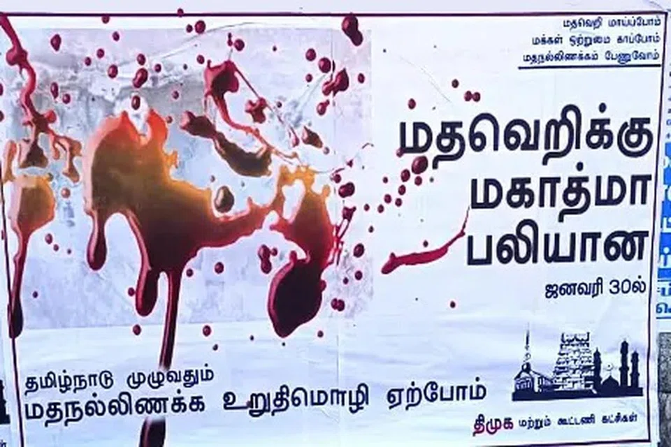 இந்நிலையில் மதுரையில் பல்வேறு பகுதிகளில் திமுக கூட்டணிக் கட்சிகள் என்ற பெயரில் பரபரப்புச் சுவரொட்டிகள் ஒட்டப்பட்டுள்ளன. இந்த சுவரொட்டியில் ‘மதவெறிக்கு மகாத்மா பலியான ஜனவரி 30’ என்று ரத்தத்துளிகள் சிதறும் படத்துடன் அச்சிடப்பட்டுள்ளது.