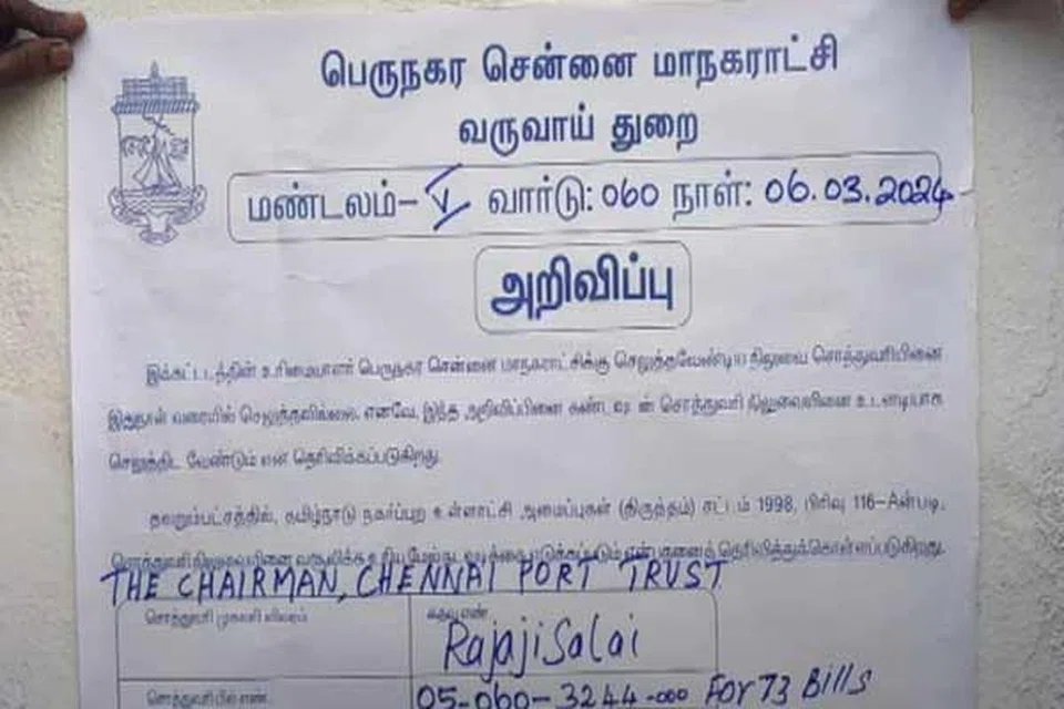 சென்னை பாரிமுனை பகுதியில் உள்ள சென்னை துறைமுக ஆணைய அலுவலகத்தின் முகப்பில் சென்னை மாநகராட்சி அதிகாரிகள் அறிவிப்புக் கடிதம் ஒன்றை ஒட்டிவிட்டுச் சென்றனர். மொத்தமாக ரூ. 10.3 கோடி சொத்து வரியைத் செலுத்தாமல் அந்நிறுவனம் காலம் தாழ்த்தி வந்ததால் சென்னை மாநகராட்சி இந்த அதிரடி நடவடிக்கையை எடுத்துள்ளது.
