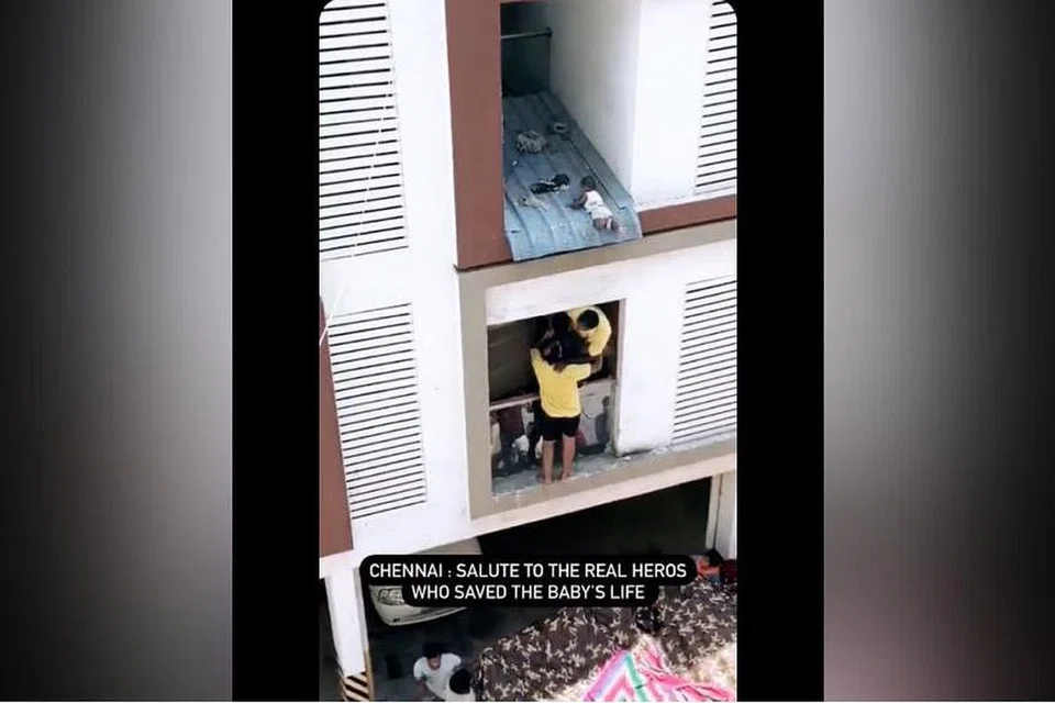 இருவரின் உதவியோடு அக்குடியிருப்பின் மேல்மாடத்திலிருந்து ஏறிய ஆடவர் ஒருவர், ஒரு கையால் அக்குழந்தையைப் பிடித்துத் தூக்கி அங்கிருந்த மற்றவர்களிடம் கொடுத்தார்.