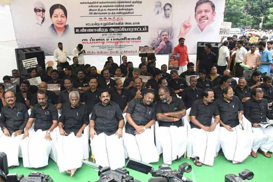 இந்த நடவடிக்கையைக் கண்டித்தும், கள்ளக்குறிச்சி கள்ளச்சாராய விவகாரம் குறித்து சிபிஐ அதிகாரிகள் விசாரணை நடத்தவேண்டும் என்று வலியுறுத்தியும் எடப்பாடி பழனிசாமி தலைமையில் அதிமுக எம்எல்ஏக்கள் சென்னை எழும்பூரில் உண்ணாவிரதப் போராட்டத்தில் ஈடுபட்டுள்ளனர்.