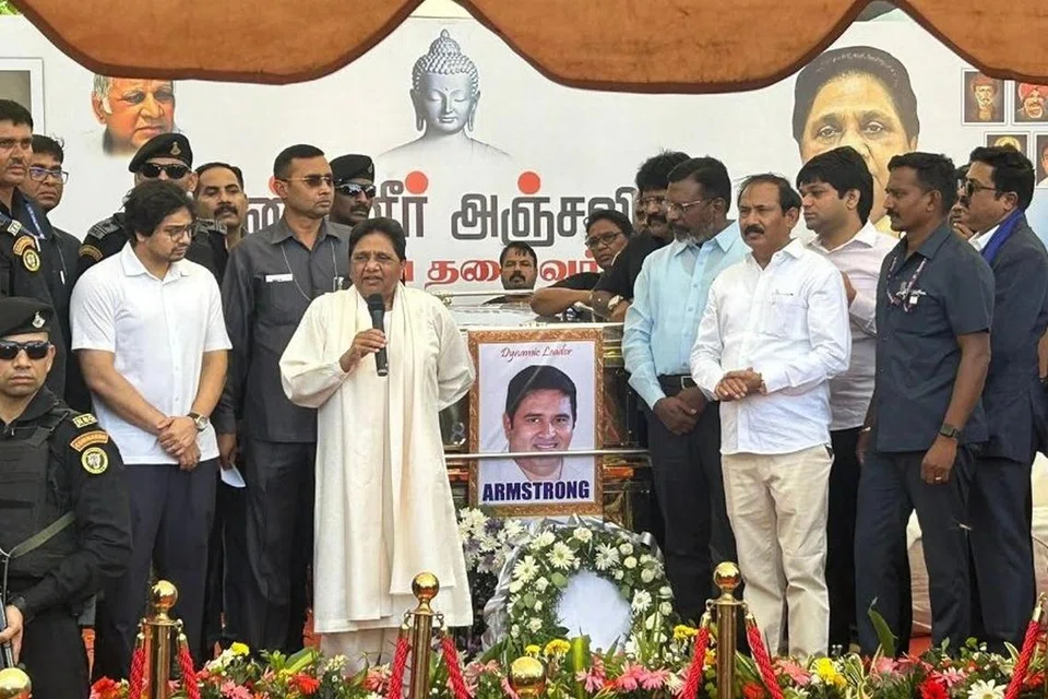 முன்னதாக முன்னாள் உத்தரப் பிரதேச மாநில முதல்வருமான மாயாவதி பெரம்பூரில் உள்ள தனியார் பள்ளியில் 52 வயது ஆம்ஸ்ட்ராங் உடலுக்கு மலர் வளையம் வைத்து அஞ்சலி செலுத்தினார்.