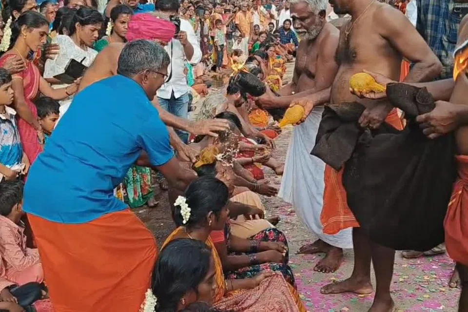 தொடர்ந்து, பக்தர்கள் தலையில் தேங்காய் உடைக்கும் நிகழ்ச்சி நடைபெற்றது. கோயில் முன்பு நேத்திக்கடன் செலுத்தும் பக்தர்களை வரிசையாக அமர வைத்து, கோயில் பூசாரி பக்தர்களின் தலையில் தேங்காயை உடைத்தார்.