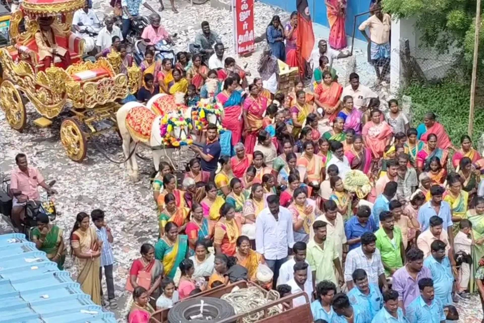 பழைய கால முறைப்படி டிராக்டர் வண்டியில் அரிசி மூட்டைகள், பழ வகைகள், வாழைத்தார்கள், சாக்லேட் வகைகள், புதிய ஆடைகள், விளையாட்டுப் பொருள்கள், ஆட்டுக் கிடாய், என 1,008 சீர்வரிசைகளுடன் பண மாலை, டிரம்ஸ், சரவெடிகள், குதிரைகள் பூட்டிய வண்டி, வாணவேடிக்கைகளுடன் திருமண மண்டபத்திற்கு ஊர்வலமாக வந்தனர்.