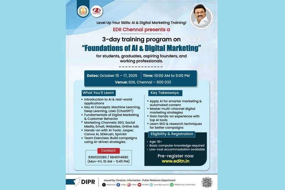 இம்மாதம் அக்டோபர் 15ஆம் தேதி முதல் சென்னை நுங்கம்பாக்கத்தில் உள்ள இடிஐஐ வளாகத்தில், ‘செயற்கை நுண்ணறிவு மற்றும் மின்னிலக்கச் சந்தைப்படுத்தலின் அடித்தளங்கள்’ என்ற அந்தப் பயிற்சி வழங்கப்படும்