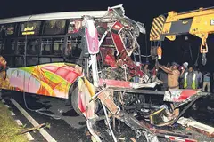 விபத்துக்குள்ளான சொகுசுப் பேருந்து ஒன்றில் சிக்கிக்கொண்ட ஓட்டுநரை இரண்டு மணி நேரத்திற்கு மேலாக தீயணைப்பு வீரர்கள் உதவியுடன் போராடி மீட்டனர்.